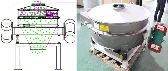 旋振篩,由單臺(tái)立式振動(dòng)電機(jī)作激振源,電機(jī)上、下兩端安裝有偏心重錘,將電機(jī)的旋轉(zhuǎn)運(yùn)動(dòng)轉(zhuǎn)變?yōu)樗?、垂直、傾斜的三次元運(yùn)動(dòng),再把這個(gè)運(yùn)動(dòng)傳遞給篩面,使物料在篩面上做外擴(kuò)漸開(kāi)線(xiàn)運(yùn)動(dòng),故該系列振動(dòng)篩稱(chēng)之為旋振動(dòng)篩。