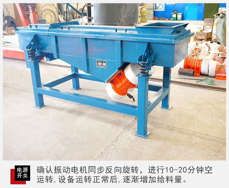 3、閉合電源開關(guān),確認(rèn)振動電機同步反向旋轉(zhuǎn),進行10-20分鐘空運轉(zhuǎn),設(shè)備在運行時如有異常聲音,應(yīng)迅速關(guān)機進行檢查處理。設(shè)備運轉(zhuǎn)正常后,可將少量需篩分的物料通過進料口設(shè)入篩機內(nèi),確認(rèn)物料向出料口方向行進,然后逐漸增加到所需和所能承受的給料量。