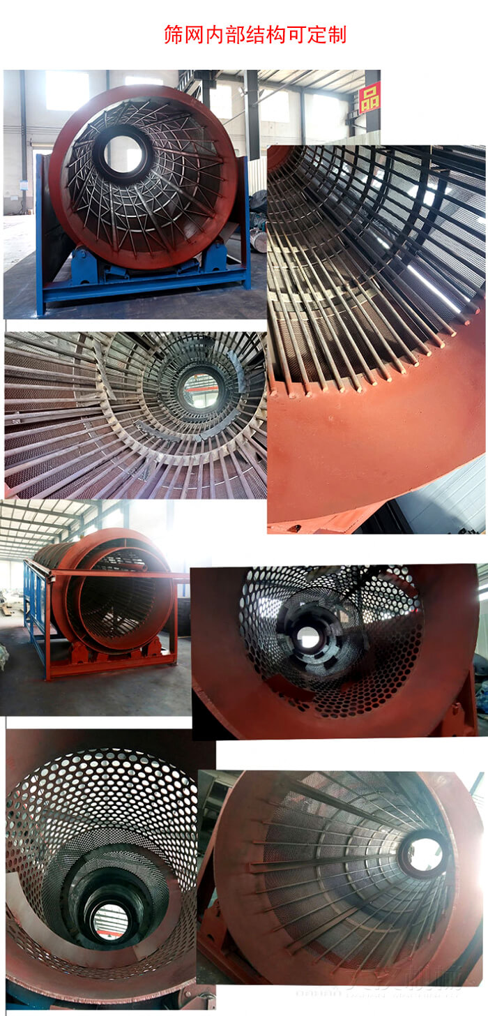 當(dāng)物料進(jìn)入重型滾筒篩內(nèi)部篩網(wǎng)時,由于滾筒裝置的傾斜與轉(zhuǎn)動,使篩面上的物料翻轉(zhuǎn)與滾動,使合格物料(篩下產(chǎn)品)經(jīng)滾筒外圓的篩網(wǎng)排出,不合格的物料(篩上產(chǎn)品)經(jīng)滾筒末端排出。由于物料在滾筒內(nèi)的翻轉(zhuǎn),滾動,使卡在篩孔中的物料可被彈出,防止篩孔堵塞。