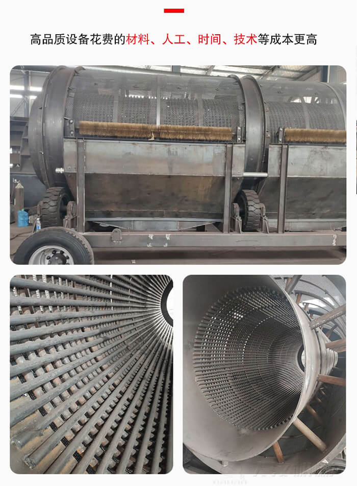 3,移動滾筒篩的結(jié)構(gòu)比較簡單大致由:中心滾筒、機(jī)架、漏斗、減速機(jī)與電動機(jī)等,所以維修比較方便,使用壽命較長,成本回收也會比較快。
